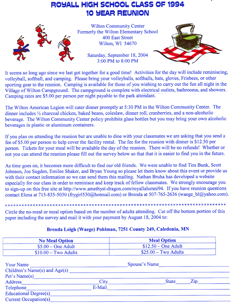 ![]() Home | Alumni News | Alumni Bios | Submit Your Info | Alumni Locations | Contact Alumni | Forum Alumni News Check back here periodically for news from and for the Class of 94! December 23, 2009 Added Facebook profile links on the Bios page. For those on Facebook, a group has been created just for members of our class. August 18, 2009 15 Year Class Reunion is planned for September 26, 2009. You can find out more by reading a copy of the reunion letter. For those on Facebook, a group has been created just for members of our class. May 28, 2006 Nathan Bruha has another son now. His name is Liam Patrick. September 22, 2004 Greg Heilman went ahead and arranged an "unofficial" reunion at the Kendall park. A bunch of people met there yesterday and pretty much just used the time to talk, eat, drink, play a few games, and just generally catch up. Those there were: Nathan Bruha (me), Greg Heilman, Brad Kammin, Nate Calkins, Darrin Hansen, Brandon Doll, Kendra Wolfgram, Patrick O'Rourke, Ann Peterson (Bunk), Kelly Joyce (Vitcenda), Jennifer Gruen (Martin), Jenny Wohlrab (Lunde), Kari Heilman (Houzner), Laura Rueckheim (Leis), Stephanie O'Gara (sorry Steph, I already forgot your newer last name), Tommy Rafajko, and Eric Clark. There were also a few spouses/significant others there, too (with appearances by several offspring). During my trip up I also got to meet and talk with Tanya Wildman (Green), Elena Hansen (Fry), and Brenda Pohlman (Waege). Overall, everyone has changed in appearance (except for Jennifer Gruen) since high school. Kendra gets my award for the most changed. Many of us have one or more kids, several are working on them (Kari, Jenny). Who knows if the next reunion/get together will be in 5 or 10 years, but most will probably be another "unofficial" one that doesn't come out of our class treasury. Either way, I plan on being there to see what happens after a few more years of life have changed us all. September 2, 2004 The official 10 year class reunion has been cancelled due to lack of sufficient numbers to cover the expenses. Several of us from out of state will still be there, and I (Nathan) am working on arranging a get together for those that would have been there anyway. For more information, you can email me at nathan@amethyst-dragon.com. June 17, 2004 The Class of 94's 10 year class reunion is scheduled for Saturday, September 18th, 2004 starting at 3:00 pm. It will be held at the Wilton Community Center (formerly the Wilton Elementary School). There will be plenty of space for volleyball, softball, and other activities. Classmates will be able to camp out right in the park if they want. Please send in your reservations for the reunion as soon as possible before August 31st. Since only a few people have responded so far, the reunion may be cancelled. More details will be posted here as they are worked out. A copy of the letter sent out to the alumni in mid-July can be found here. March 20, 2004 Elena Fry has gotten married. Congratulations! August 14, 2003 Nathan Bruha has a son now. His name is Connor Gregory, and he's quite a personality! January 6, 2003 Elena Fry has gotten engaged to a firefighter. They'll be getting married in March of 2004. Best of luck to them both. December 5, 2002 Nathan Bruha and his wife are pregnant. They plan on having their first child in early August. November 30, 2002 Brenda Waege got married on November 30th of this year in Caledonia, MN. Best wishes go out to her and her husband. December 5, 2001 The first emails and letters about this site go out. Search engines like Yahoo! should start listing us soon. June 24, 2001 The Class of 94 Alumni web site goes online! You can use it to leave information about yourself and find information about your classmates from Royall. For current information about Royall, you can click here to visit the official school district site. Home | Alumni News | Alumni Bios | Submit Your Info Alumni Locations | Contact Alumni | Forum © 2001 - 2009 Nathan Bruha. All rights reserved. |