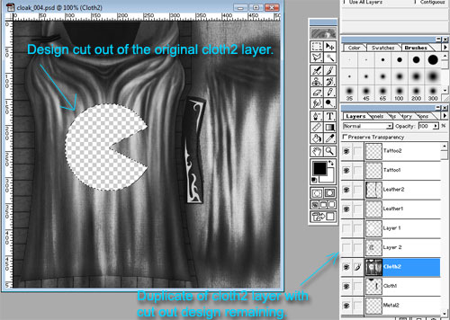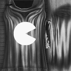 Then we need to cut out Pacman from the Cloth2 layer. Select the overlayed design: do not use anti-aliasing, blurring, or any sort of feathered/wet edges...this leads to ugly black lines on the finished .plt. A good idea is to shrink the marque by 1 pixel to remove any possible "grunge" from the outline (which can come from resizing). Also, make a duplicate of the Cloth2 (in this texture's case) and inverse the selection so it's like you cut the design out of the cloth...we'll need this cutout for later.