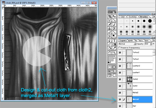 Now, we place our design layer as Metal1. Then we overlay the cloth textured cutout on top of it and set the cloth version to "Multiply" at 50%. This overlay is to retain the wrinkles and shadows in the cloth so the logo doesn't appear as flat. Merge the Metal1 and copy of Cloth2 to the new Metal1 channel.