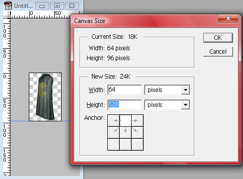 Now that the cloak is on its own, it's time to resize the canvas: First to 64 pixels wide x 96 pixels high (to properly center our new cloak), then again to 64 x 128 pixels (our final size, adding the new space at the bottom).
