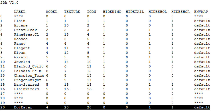 Once you have your new cloak texture functional, and the files renamed and stored in an easy to remember spot, it's time to do some 2da editing. Open Notepad (or similar plain text editor), then use that to open cloakmodel.2da (you should just be able to drag/drop it into the editor window).