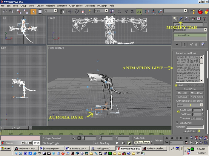 This tutorial is intended to help the beginner that wants to add animations to a new creature model for Neverwinter Nights. It was originally written for custom content makers working on making creatures for the Community Creature Pack, but it is very informative for anyone that wants to animate a creature.