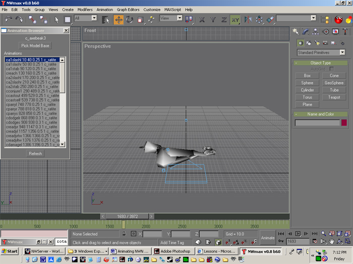 A small warning… Anim Browser will not work for animations that are only 1 frame long. The cdead and cgetmidlp animations are keyed as 1 animation long by default and thus Anim Browser does not display them. You can make them 3 or 4 frames long if you like as talked about earlier. When you make changes to the animations on the Aurora base, you also have to press “refresh” on Anim Browser for them to be reflected.