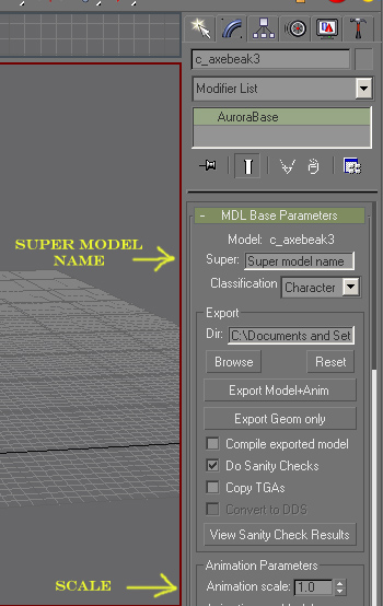 Look on top of that right hand column again. Were looking for a little blue symbol that looks like a little blue rainbow that says “modify” when your cursor hovers over it (it should be 4 left of the easy to see little hammer). Click it. We are getting ready to save / export your newly renamed model. Look for a little check box that says “Do Sanity Checks” near the bottom of the left hand column. Always uncheck that, it’s nothing but a pain in the ass. About an inch above that is the “Export” field. Below that is a “browse” button. Click that and navigate to a place you would like to save this new test model to. Now, press the near by button that says “Export Model+Anim”. At the lower left corner you’ll see some black text scroll across a small white area and that’s about it.