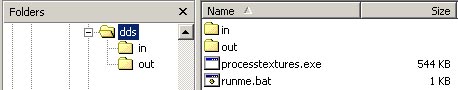 After unzipping the tool, you will find 2 files in the 'dds' folder (processtextures.exe and runme.bat) along with 2 directories labelled 'in' and 'out'.