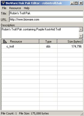 3. You will now see the texture file listed as a resource in the Hak Pak. Add a title and description to your Hak Pak, and save it to your 'hak' folder where you have installed Neverwinter Nights (The default location is C: \NeverwinterNights \NWN \hak).